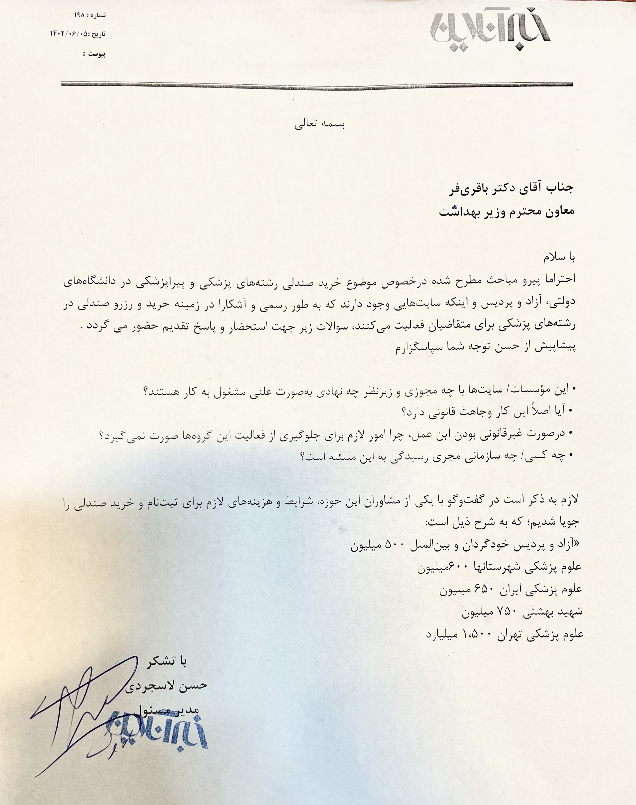 علیرغم پیگیریهای رسمی و جاری از سوی خبرآنلاین و گفتوگو با روابط عمومی معاونت آموزش وزارت بهداشت و مسئول دفتر معاون آموزشی وزارت بهداشت و باوجود ارسال نامه زیر، انتظار ۴۸ ساعته و تماسهای خبرآنلاین برای دریافت پاسخ، بینتیجه ماند.